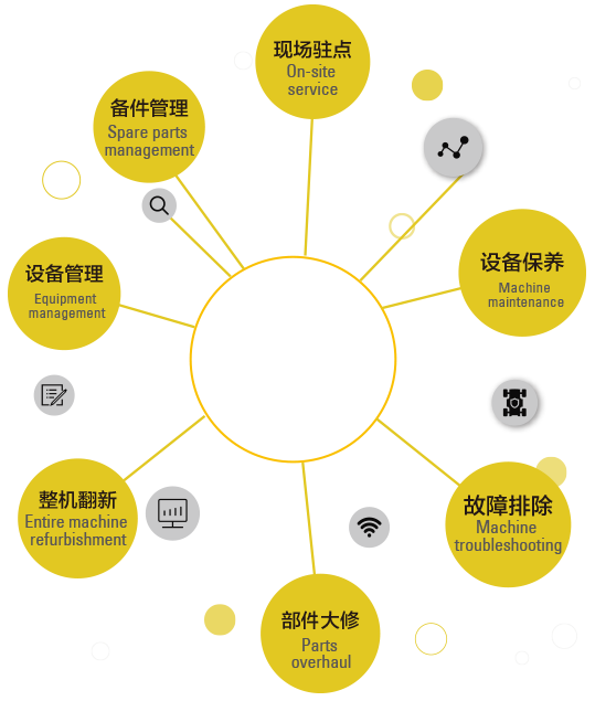 信昌可根据客户需求提供定制化管理服务,可定制的内容除了 涵盖设备管理的6 项(定期油样分析、绕机检查、技术分析、 远程监测、底盘状态检测、综合评估),还可以提供设备保养、 故障排除、部件大修、整机翻新、备件管理、现场驻点等服务。